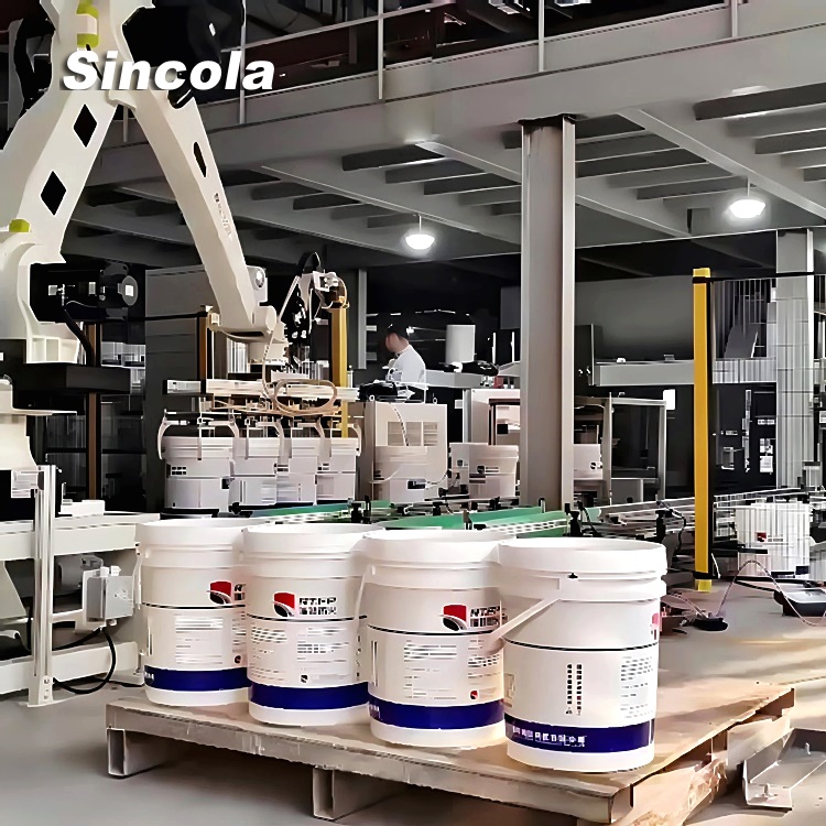 SINCOLA MACHINERY barrel palletizing robot can palletize a variety of barreled water, paint, road materials, edible oil, water-soluble fertilizer, real stone paint and other materials. The machine body is sturdy, has long service life, low failure rate and requires no maintenance. The clamping system has an adjustable structure, with no knots in high, low, loose or tight, adapting to different sizes of round barrels and square barrels. It can grab two to four barrels at a time, and the movement is gentle and stable without dropping the barrels. The title improves the automation level of enterprises and enhances market competitiveness.